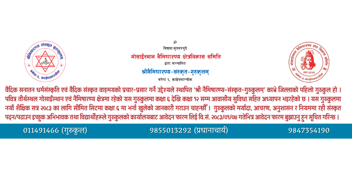भर्ना खुल्यो! नि:शुल्क भोजन, आवास र शैक्षिक सामग्रीको व्यवस्थासहित शैक्षिक सत्र २०८३ का लागि कक्षा ६ मा भर्ना खुल्यो | आवेदन दिने अन्तिम मिति: 2083/01/04 | सम्पर्क: 011-491466, 9855013292